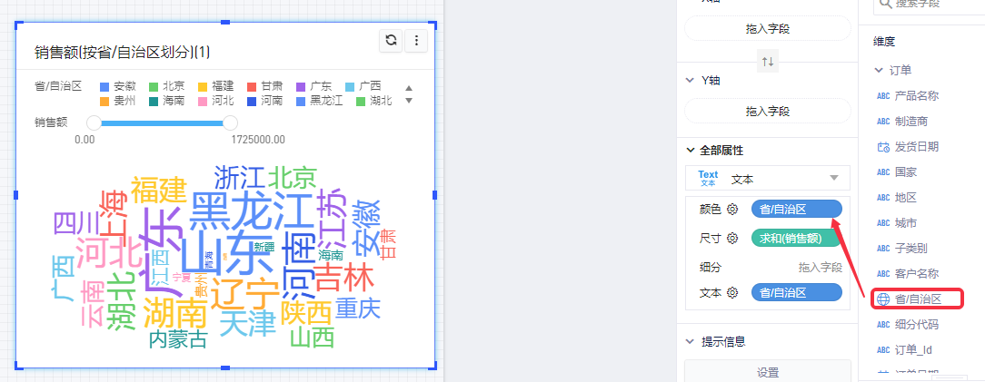 以默认数据模型为例,查看不同省份的销售额情况,涉及到的字段有:度量“销售额”,维度“省份”。