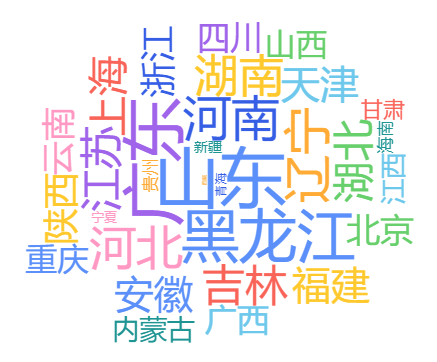 如图下所示,不同省份用不同颜色表示,省份字体的大小代表其销售额的大小,销售额越大,字体越大。