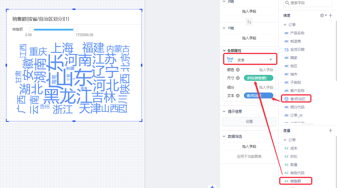 (2)将“省/自治区”字段拖入属性面板的文本区域,将“销售额”字段拖入属性面板的尺寸区域,并将图表类型选择为“文本图”类型;