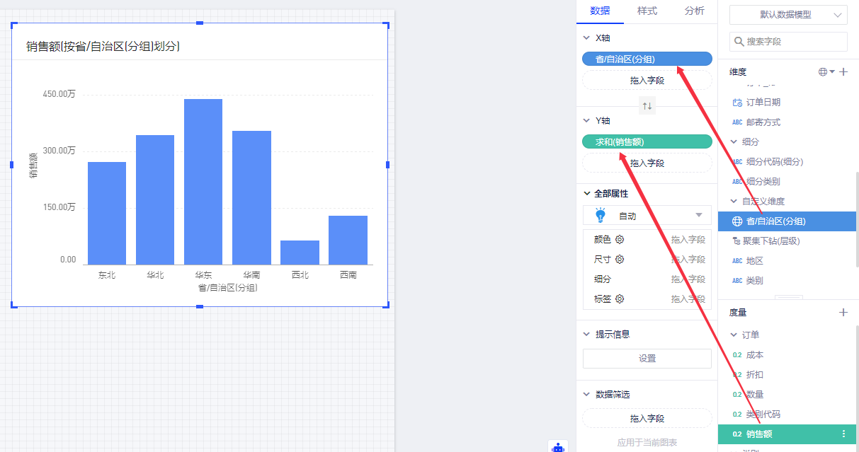 (3)新建个图表,将新的组字段和销售额依次拖入,得到一个自定义地区的销售额分布图。