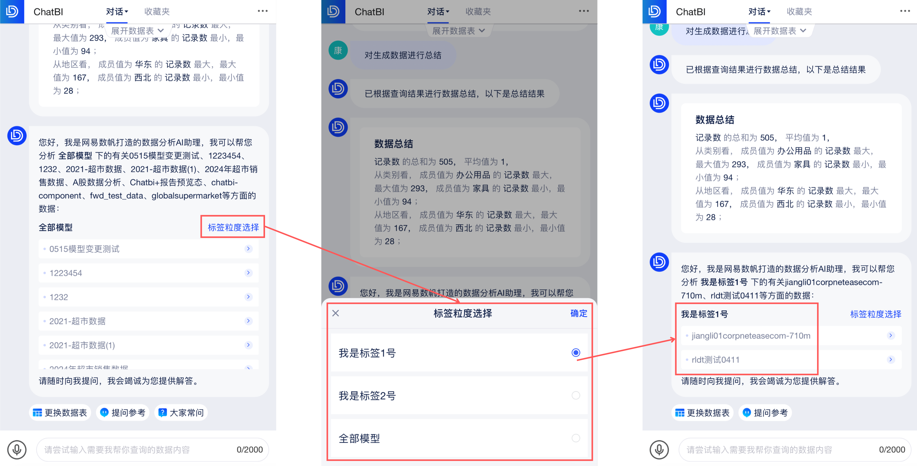 选定标签后,点击「更换数据表」,可选择自己想要查询的数据表,支持多选数据表(若勾选多表后AI问答效果不佳,可尝试减少勾选表格或仅选择单表,有时能给AI问答带来一定准确率的提升)