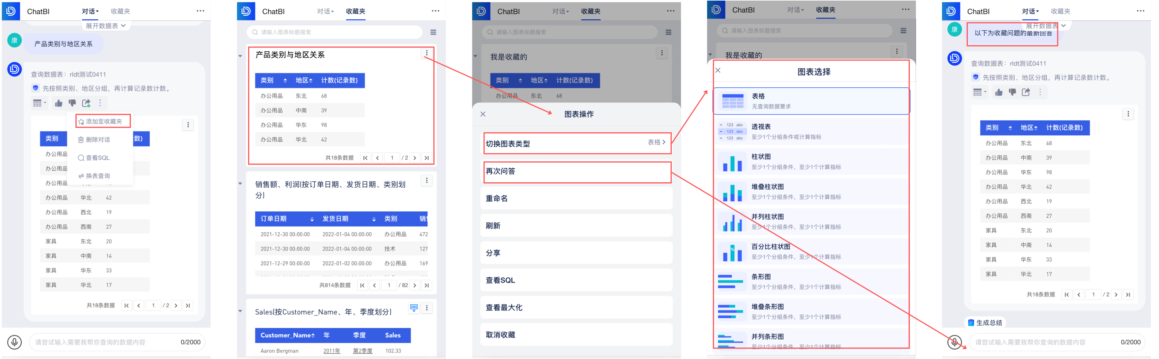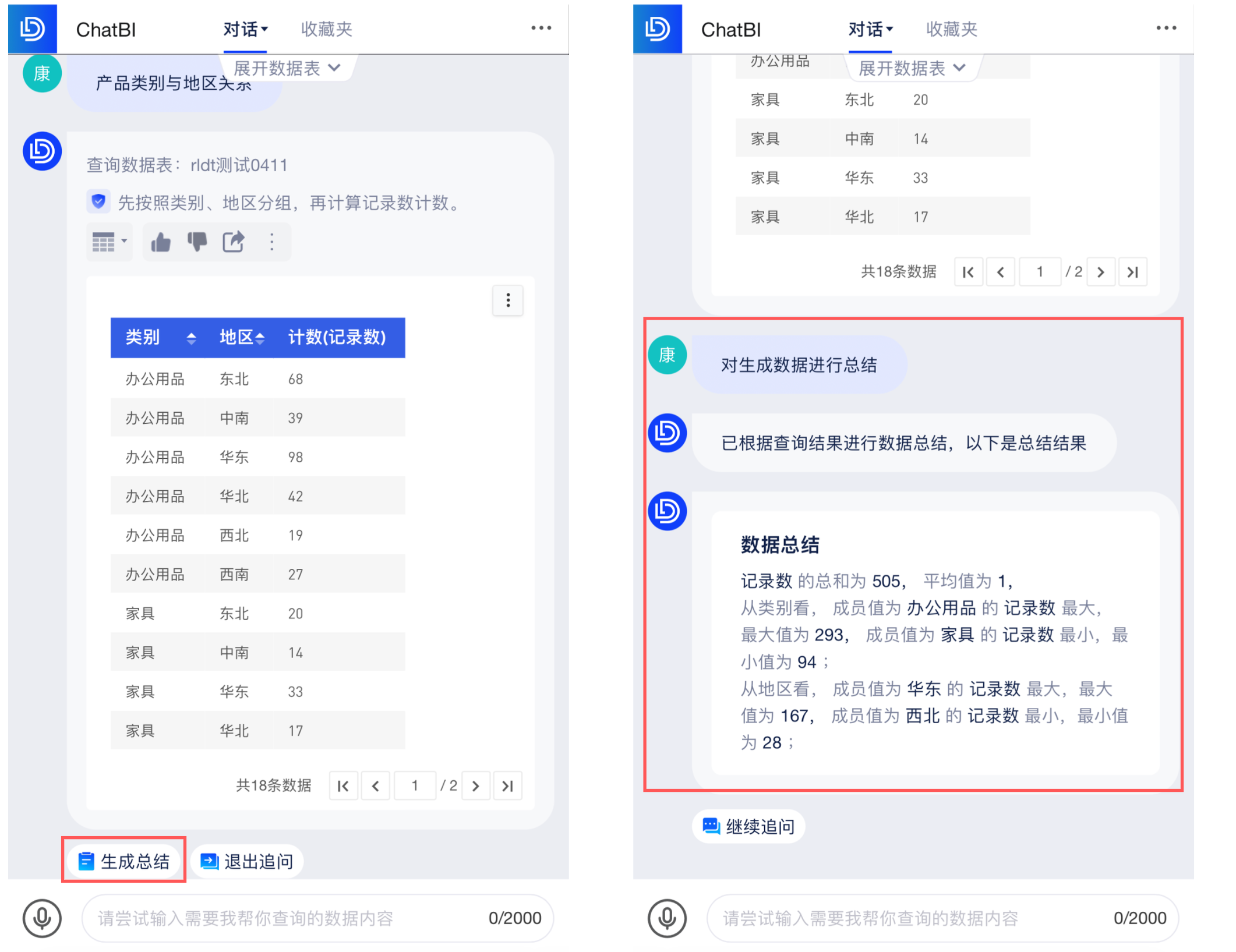 基于ChatBI问答展示的图表,提供自动生成数据总结,通过描述性统计,帮助您快速获取全面且准确的数据概述。例如,当用户查看"产品类别与地区关系"时。
