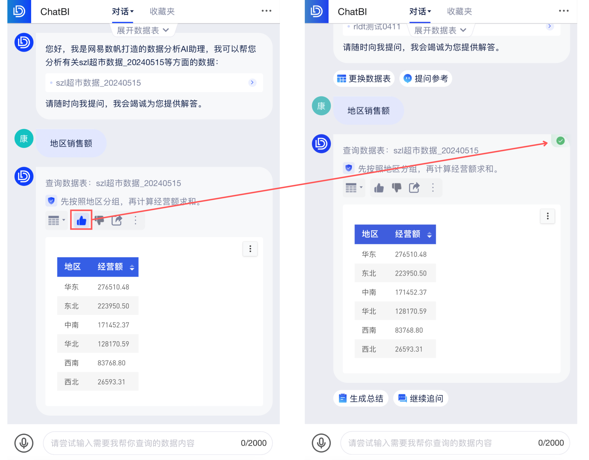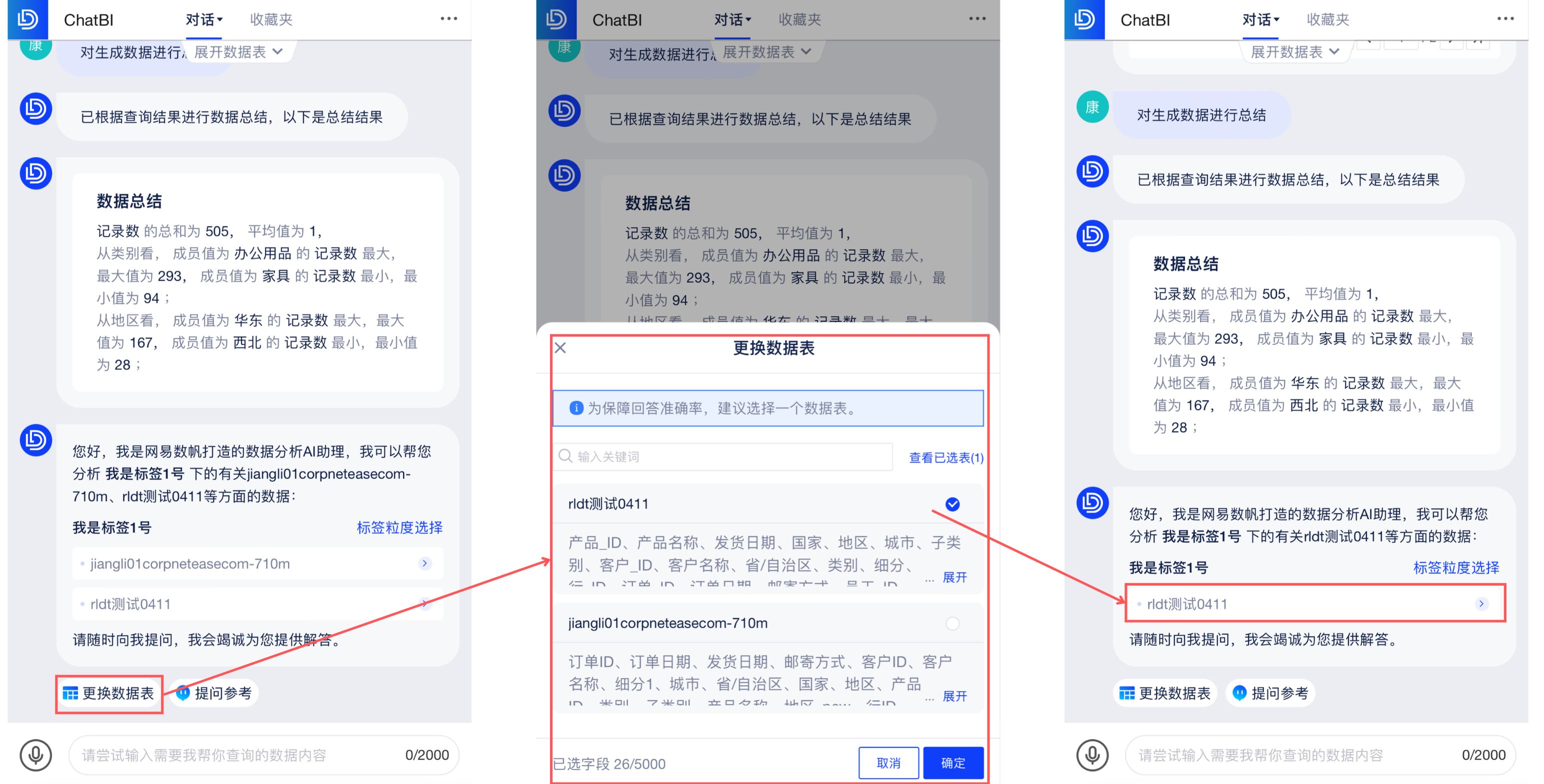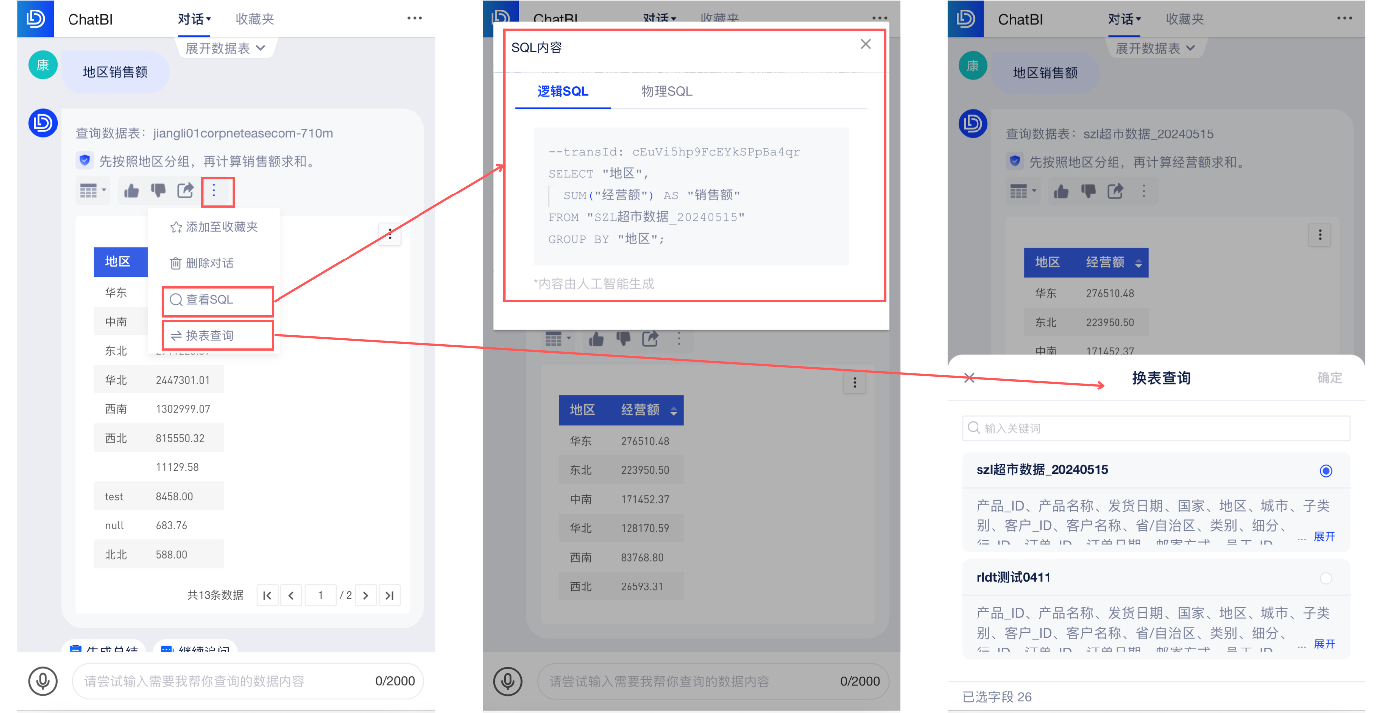 若AI选错了数据表,可点击「换表查询」,校正为正确的数据表。