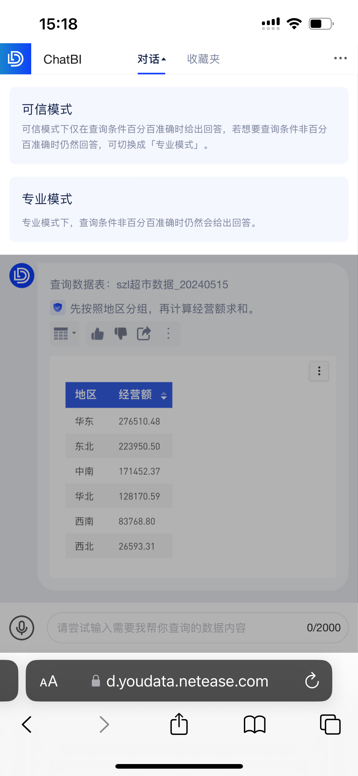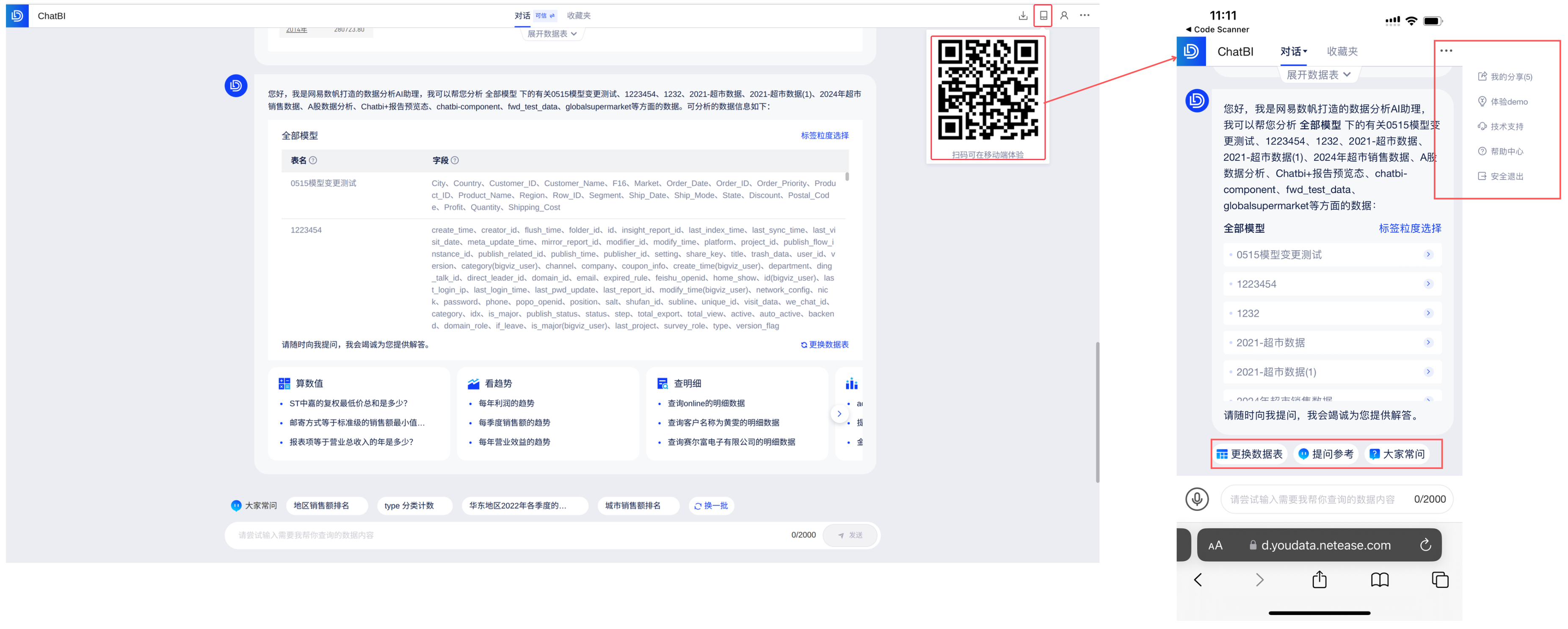 在web端ChatBI界面,通过扫描二维码,可进入移动端。问答支持功能:更换数据表、提问参考、大家常问;界面组件:收藏夹、我的分享。展示如下图: