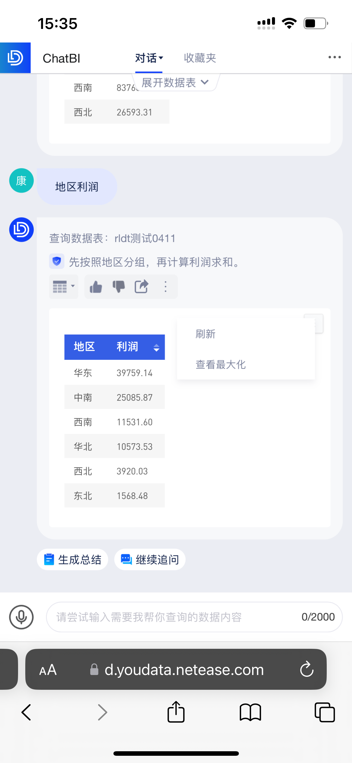 你可以直接在底部输入框中提问(当前仅支持从单个数据表中查询结果),AI助手会回答查询条件和查询结果,如下图:
