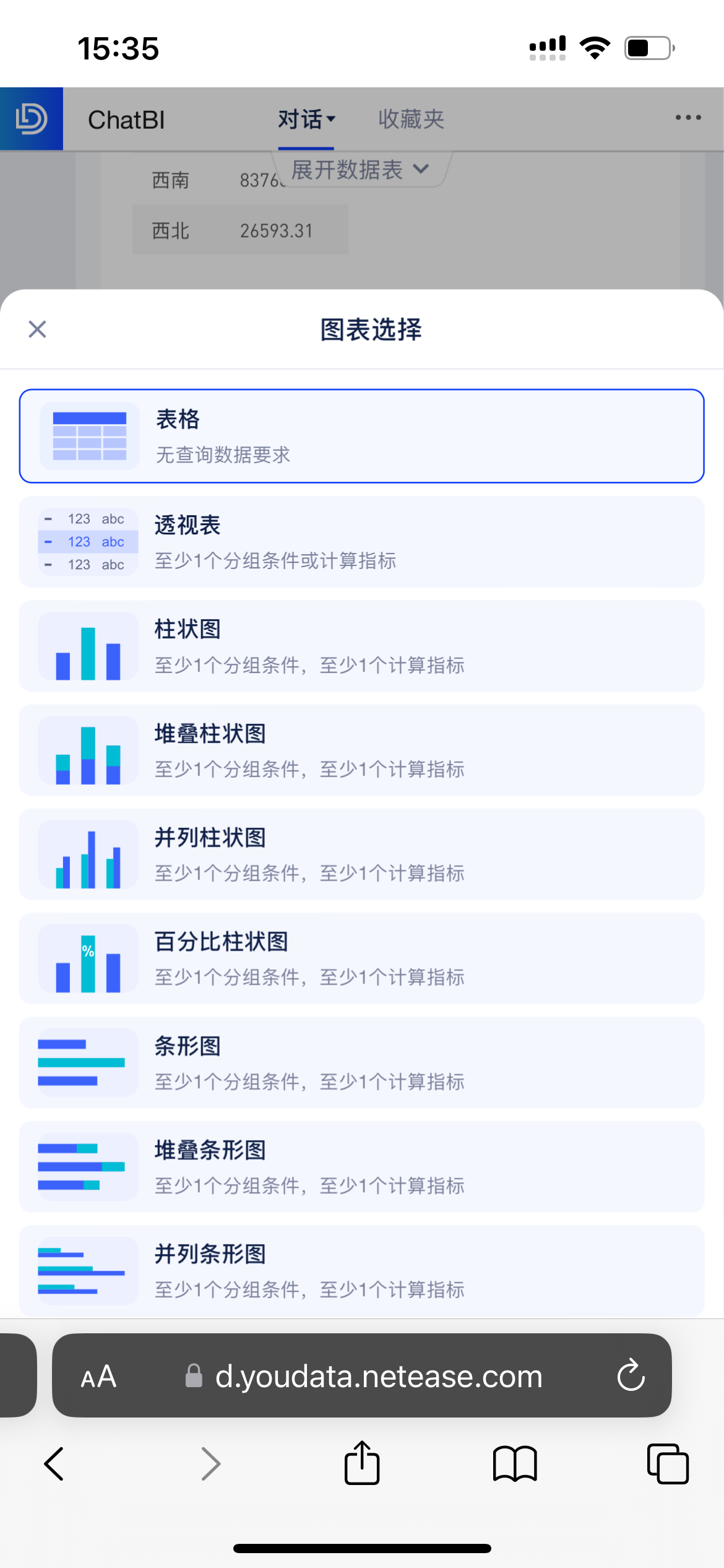 问答结果可以切换不同的图表类型,目前支持表格、指标卡、透视表、柱状图、堆叠柱状图、并列柱状图、百分比柱状图、条形图、堆叠条形图、并列条形图、折线图、区域图、双轴图、饼图、环形图、散点图、气泡图、热力地图和标记地图。