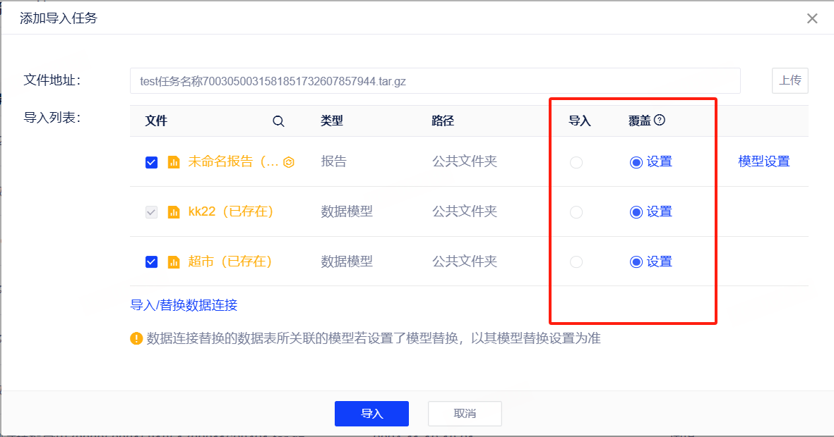 覆盖:可选择覆盖已有资源,点击设置可选择覆盖配置。