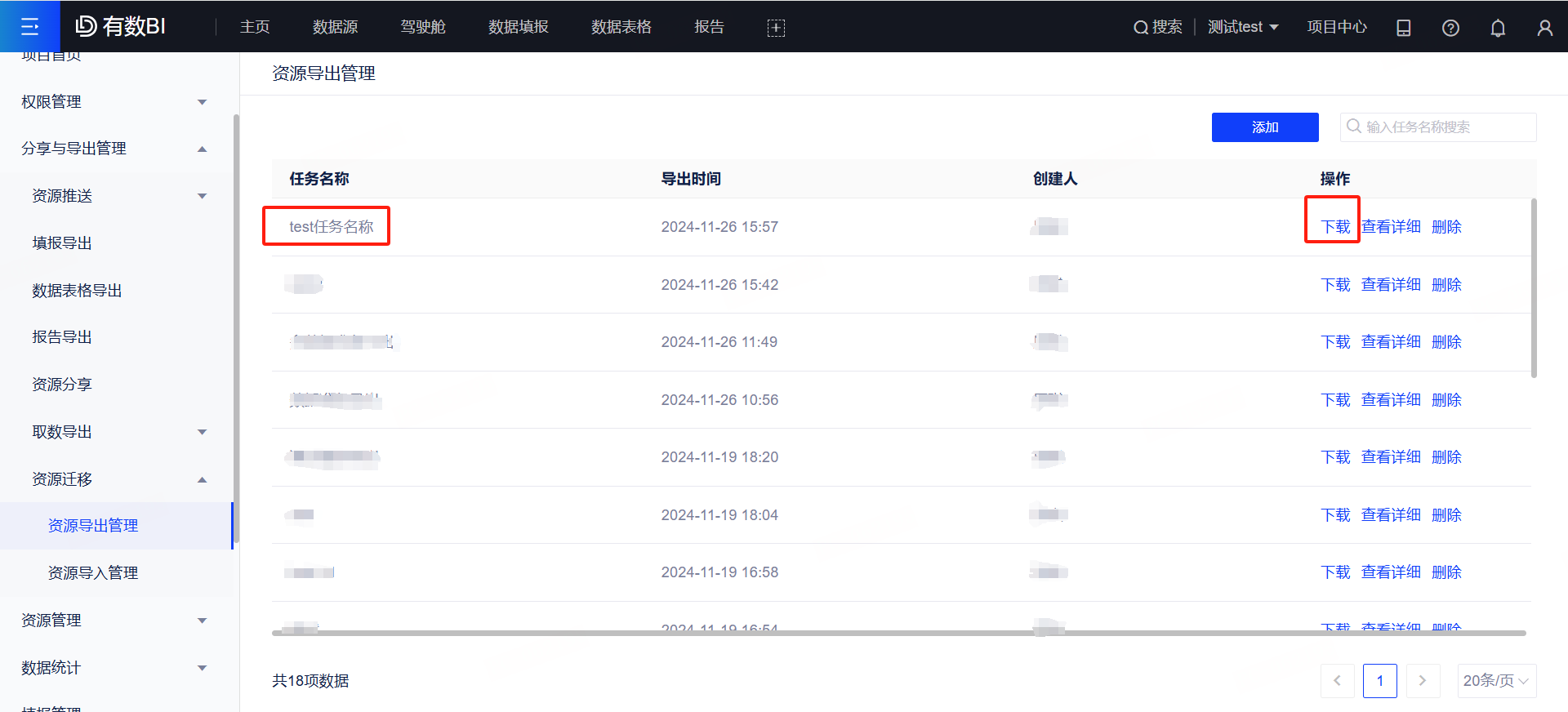 (3)在资源导出管理列表页,找到刚才设置的任务名称,再点击其右侧“导出”按钮,将资源下载至本地,完成导出。