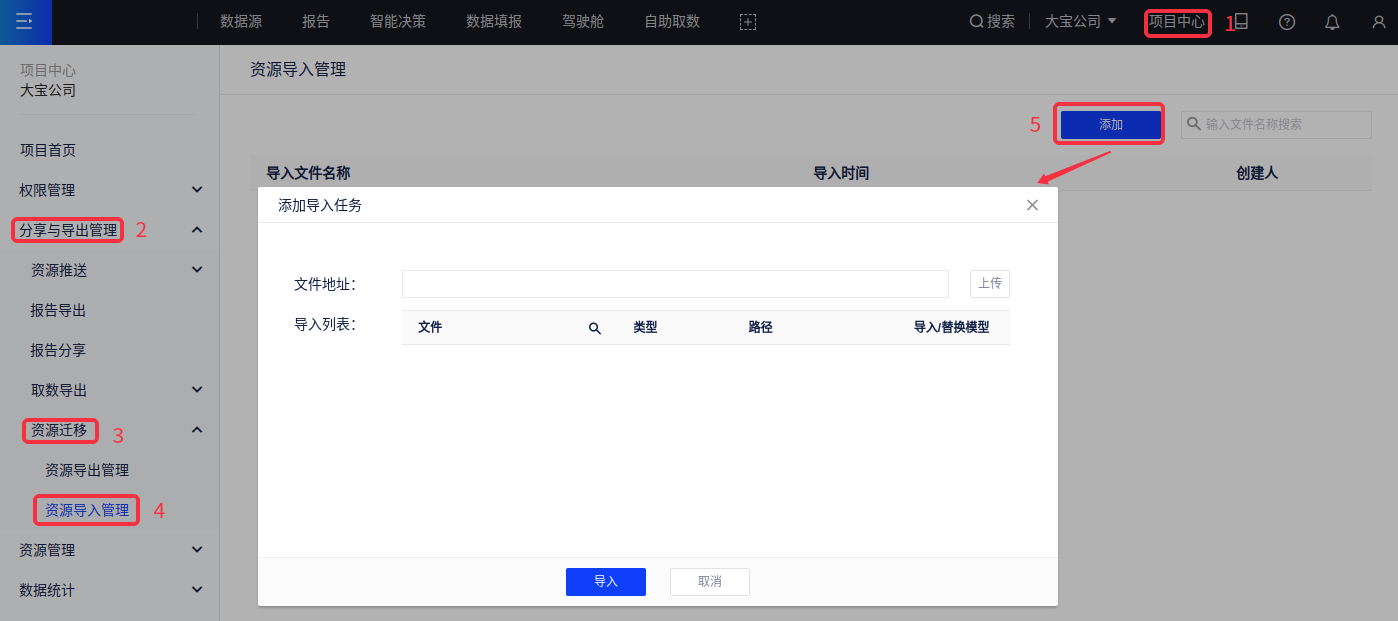 (1)进入目标项目中心,依次选择[分享与导出管理-资源迁移-资源导入管理-添加],创建一个导入任务;