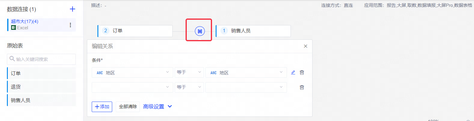 如果公共字段的值不唯一,即“地区”的多个值可以与“销售人员表”中的多个行对应,请选择“多”,如果您不清楚字段的对应情况,也请选择“多”,当前表跟其他表关联时会先聚合再关联