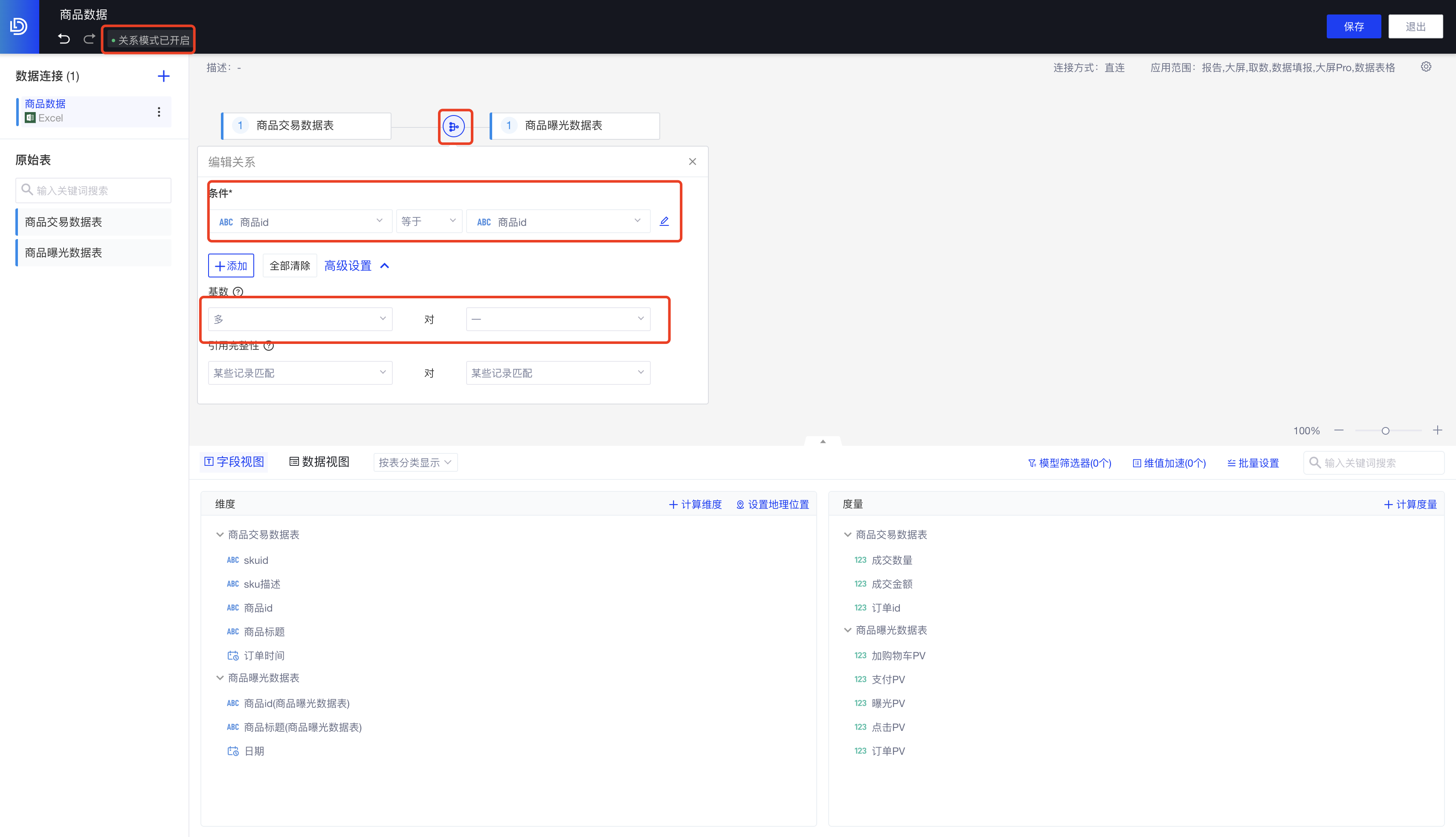 • 步骤2:拖入要分析的“商品交易数据表”、“商品曝光数据表”